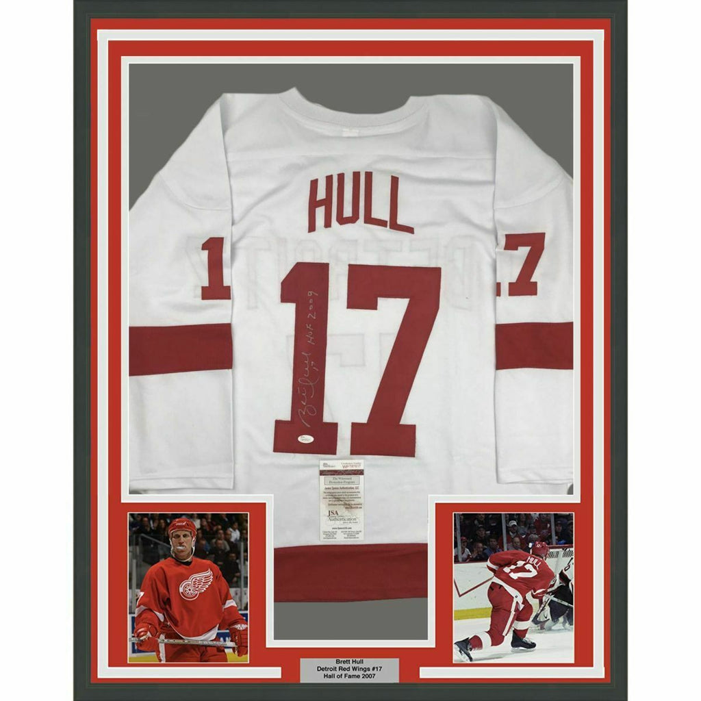 FRAMED Autographed/Signed BRETT HULL HOF 2009 33x42 Detroit White Jersey JSA COA The item is professionally framed & matted with two 8x10 photos, measures 33"x42" and is ready to be hung in your man cave! NOTE: COA card will be mounted on the back of the frame, not inside it on top of the jersey as seen in the picture.