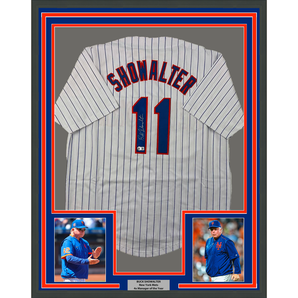 Framed Autographed/Signed Buck Showalter 33x42 Pinstripe Jersey Beckett BAS COA The item is professionally framed and matted with two 5x7 photos, measures 35 inches by 39 inches and is ready to be hung in your man cave! Photo and matting requests can be made.