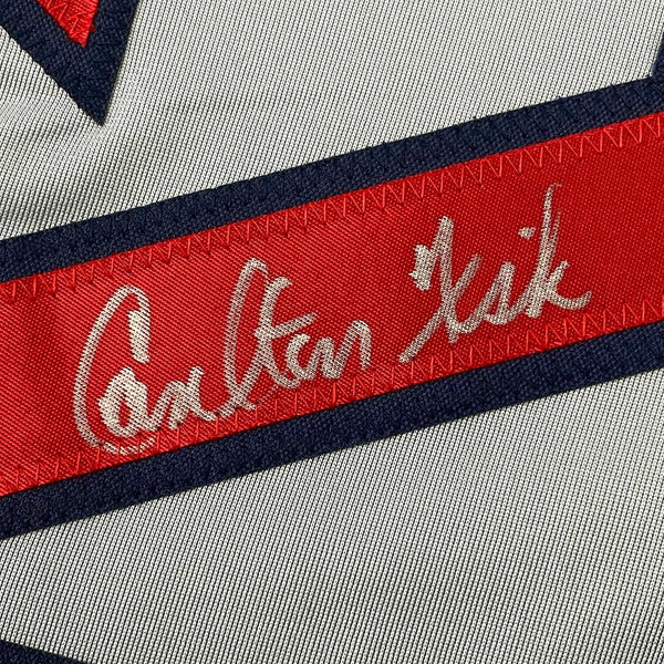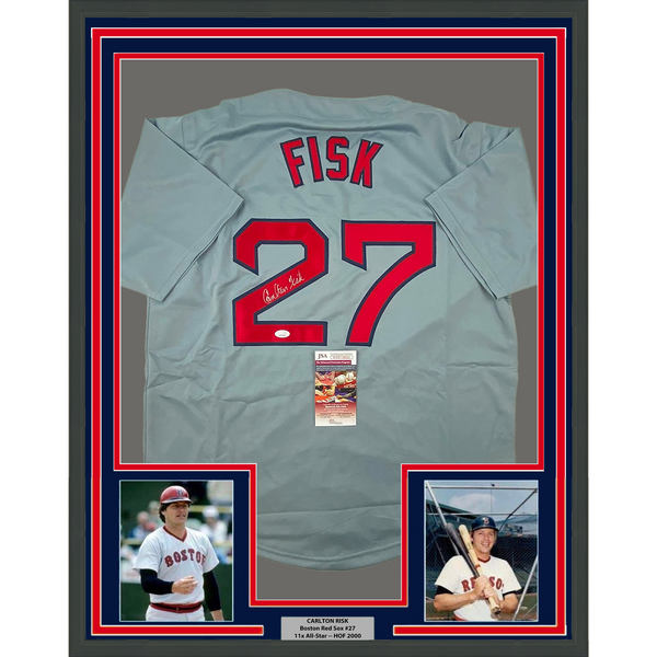 Framed Autographed/Signed Carlton Fisk 33x42 Boston Grey Baseball Jersey JSA COA