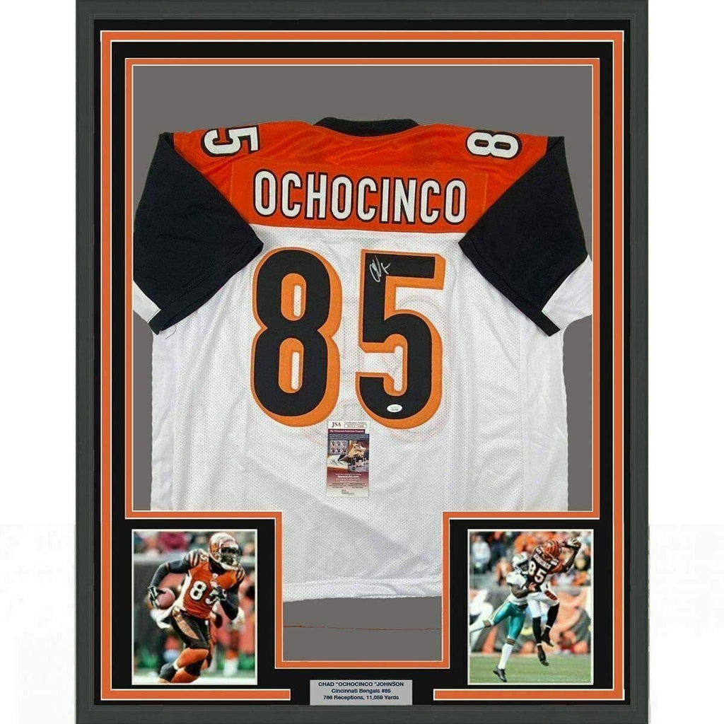 FRAMED Autographed/Signed CHAD OCHOCINCO Johnson 33x42 White Jersey JSA COA Auto The item is professionally framed & matted with two 8x10 photos, measures 33"x42" and is ready to be hung in your man cave! NOTE: COA card will be mounted on the back of the frame, not inside it on top of the jersey as seen in the picture.