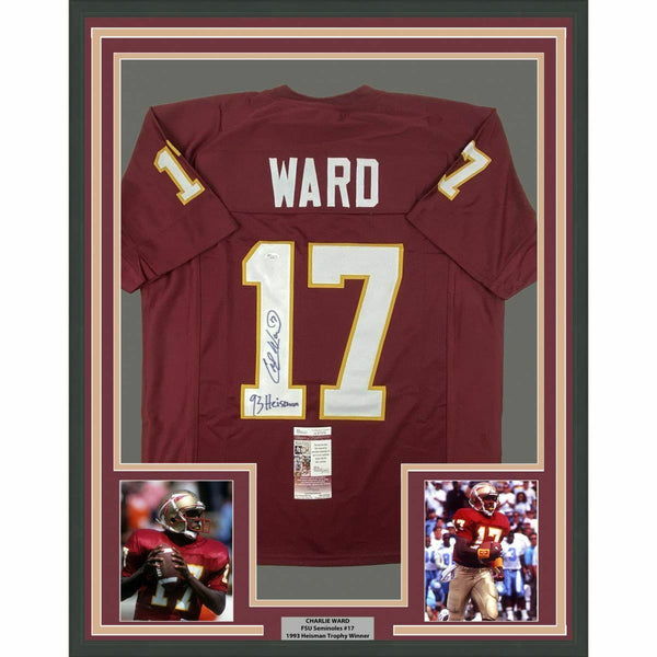 FRAMED Autographed/Signed CHARLIE WARD 33x42 Florida Maroon Jersey JSA COA The item is professionally framed & matted with two 8x10 photos, measures 33"x42" and is ready to be hung in your man cave! NOTE: COA card will be mounted on the back of the frame, not inside it on top of the jersey as seen in the picture.