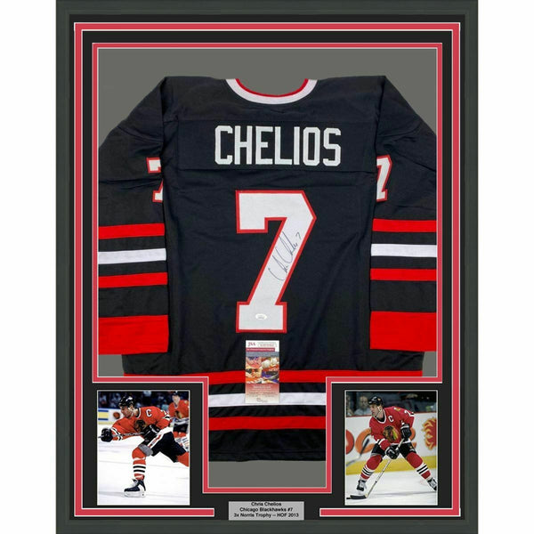 FRAMED Autographed/Signed CHRIS CHELIOS 33x42 Chicago Black Jersey JSA COA Auto The item is professionally framed & matted with two 8x10 photos, measures 33"x42" and is ready to be hung in your man cave! NOTE: COA card will be mounted on the back of the frame, not inside it on top of the jersey as seen in the picture. Please allow up to 5 business days for the item to be framed, packaged safely, and picked up by USPS. Photo and matting requests can be made.
