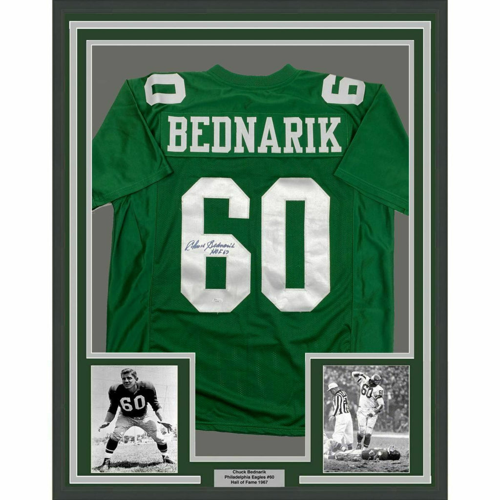 FRAMED Autographed/Signed CHUCK BEDNARIK 33x42 Philadelphia Green Jersey JSA COA The item is professionally framed & matted with two 8x10 photos, measures 33"x42" and is ready to be hung in your man cave! NOTE: COA card will be mounted on the back of the frame, not inside it on top of the jersey as seen in the picture.