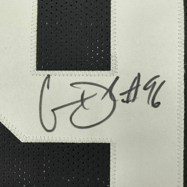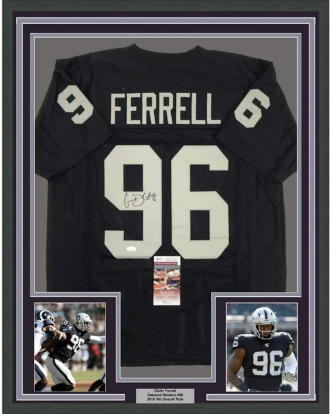 FRAMED Autographed/Signed CLELIN FERRELL 33x42 Oakland Black Jersey JSA COA Auto The item is professionally framed & matted with two 8x10 photos, measures 33"x42" and is ready to be hung in your man cave! NOTE: COA card will be mounted on the back of the frame, not inside it on top of the jersey as seen in the picture.