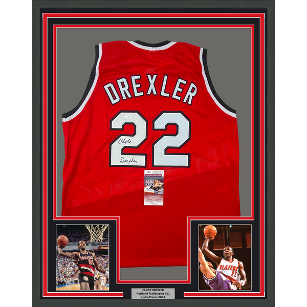 Framed Autographed/Signed Clyde Drexler 33x42 Portland Red Jersey JSA COA The item is professionally framed & matted with two 8x10 photos, measures 33"x42" and is ready to be hung in your man cave! NOTE: COA card will be mounted on the back of the frame, not inside it on top of the jersey as seen in the picture.