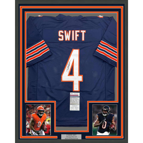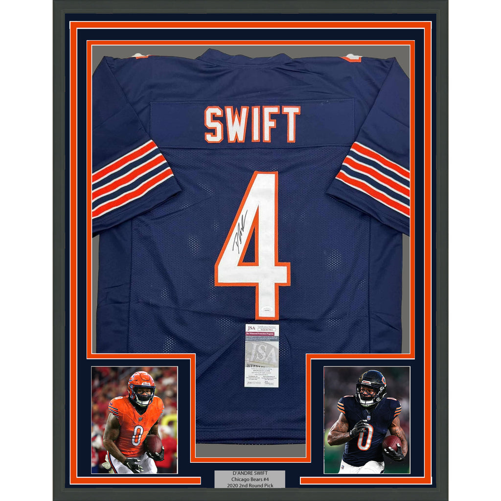 Framed Autographed/Signed D'Andre Swift 35x39 Chicago Blue Jersey JSA COA The item is professionally framed and matted with two 5x7 photos, measures 35x39 inches and is ready to be hung in your man cave! Photo and matting requests can be made.