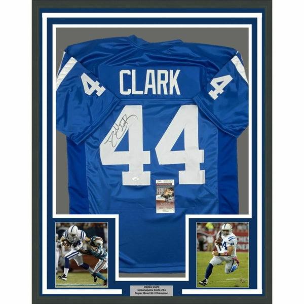 FRAMED Autographed/Signed DALLAS CLARK 33x42 Indianapolis Blue Jersey JSA COA The item is professionally framed & matted with two 8x10 photos, measures 33"x42" and is ready to be hung in your man cave! NOTE: COA card will be mounted on the back of the frame, not inside it on top of the jersey as seen in the picture. Please allow up to 5 business days for the item to be framed, packaged safely, and picked up by UPS. Photo and matting requests can be made.