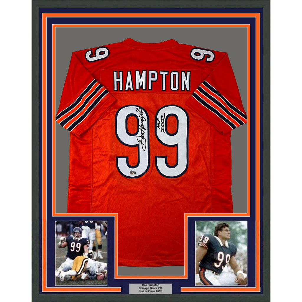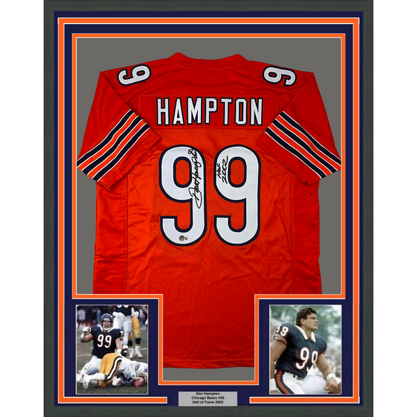Framed Autographed/Signed Dan Hampton 33x42 HOF 2002 Orange Jersey Beckett COA The item is professionally framed & matted with two 5x7 photos, measures 33"x42" and is ready to be hung in your man cave! NOTE: COA card will be mounted on the back of the frame, not inside it on top of the jersey as seen in the picture.