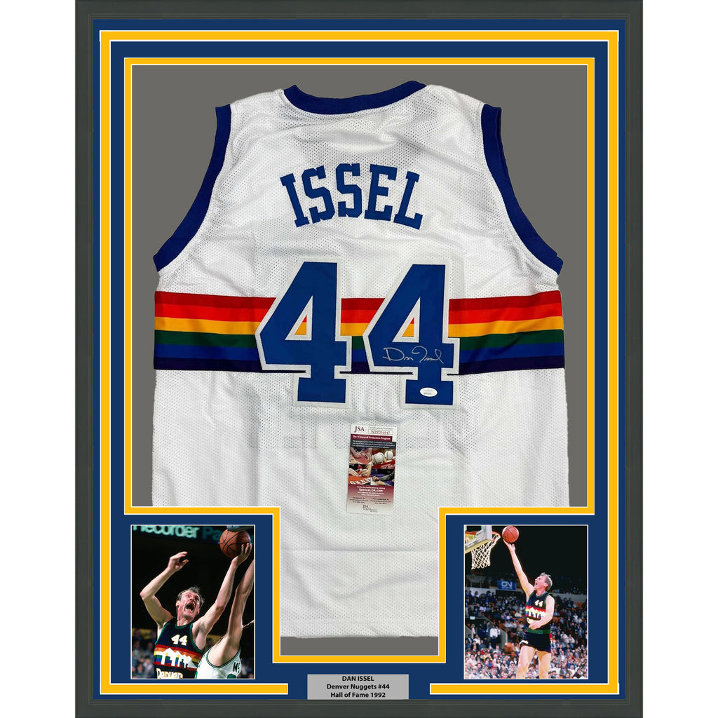 Framed Autographed/Signed Dan Issel 35x39 Denver White Rainbow Jersey JSA COA The item is professionally framed and matted with two 5x7 photos, measures 35x39 inches and is ready to be hung in your man cave! Photo and matting requests can be made.
