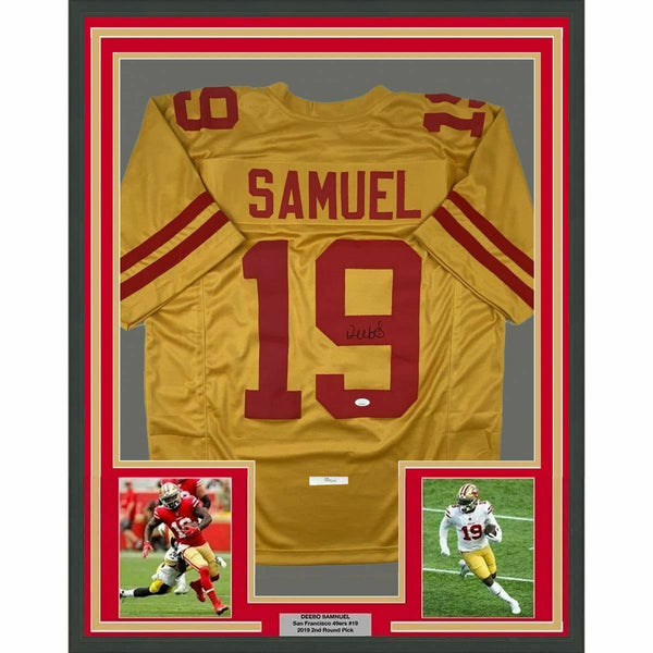 FRAMED Autographed/Signed DEEBO SAMUEL 33x42 Gold Football Jersey JSA COA The item is professionally framed & matted with two 8x10 photos, measures 33"x42" and is ready to be hung in your man cave! NOTE: COA card will be mounted on the back of the frame, not inside it on top of the jersey as seen in the picture. Please allow up to 5 business days for the item to be framed, packaged safely, and picked up by UPS. Photo and matting requests can be made.