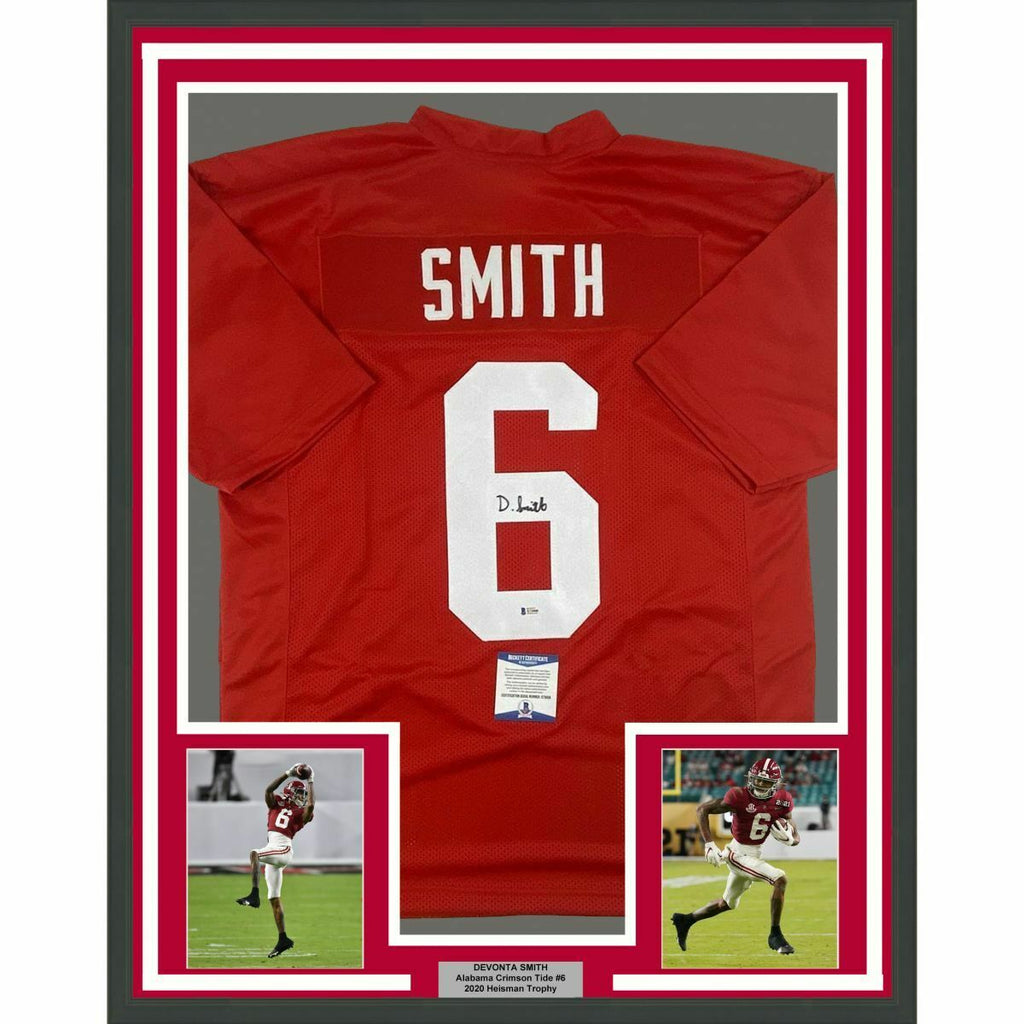 FRAMED Autographed/Signed DEVONTA SMITH 33x42 Alabama Red College Jersey BAS COA The item is professionally framed & matted with two 8x10 photos, measures 33"x42" and is ready to be hung in your man cave! NOTE: COA card will be mounted on the back of the frame, not inside it on top of the jersey as seen in the picture.