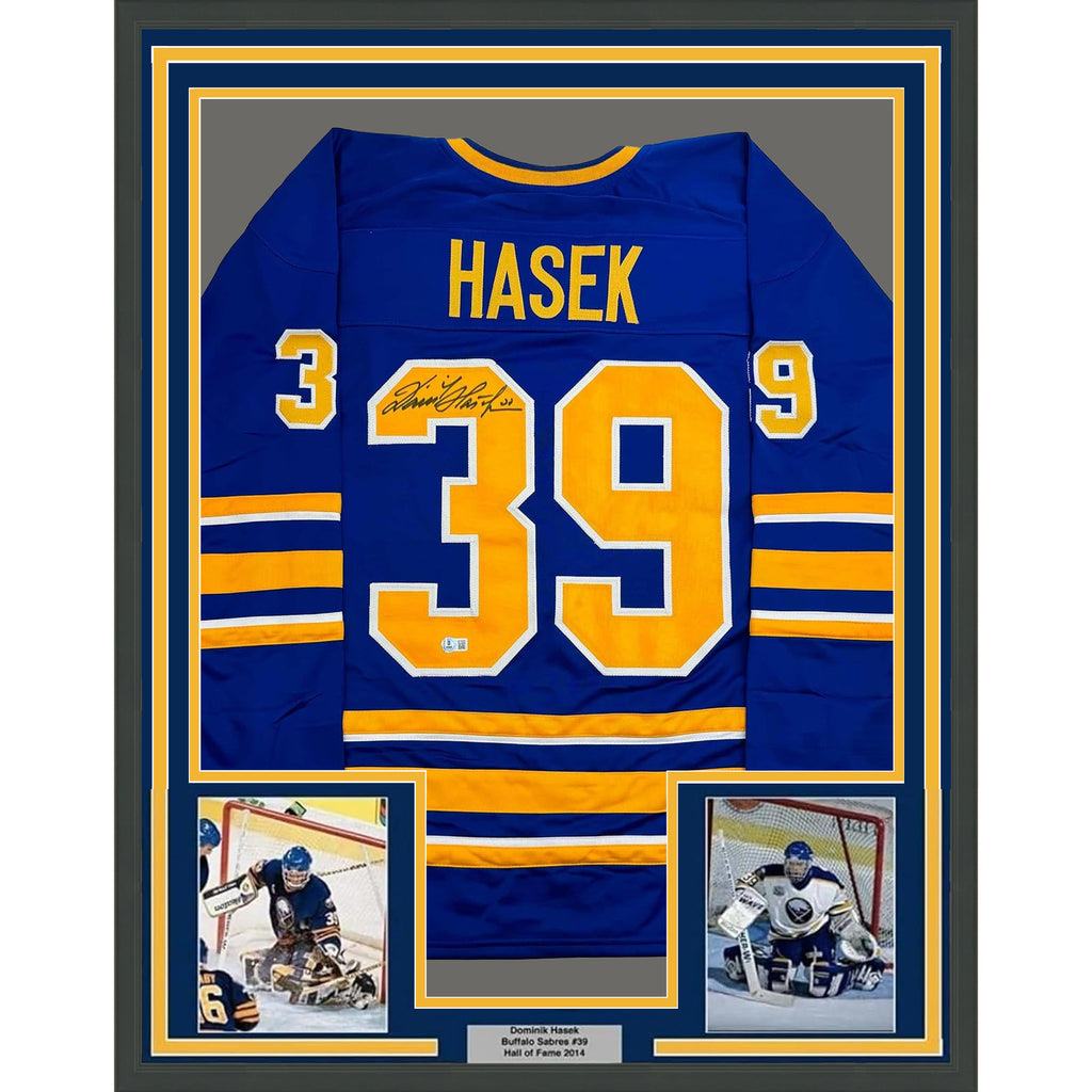 Framed Autographed/Signed Dominik Hasek 35x39 Buffalo Blue Hockey Jersey BAS COA The item is professionally framed and matted with two 5x7 photos, measures 35x39 inches and is ready to be hung in your man cave! Photo and matting requests can be made.