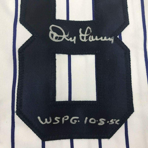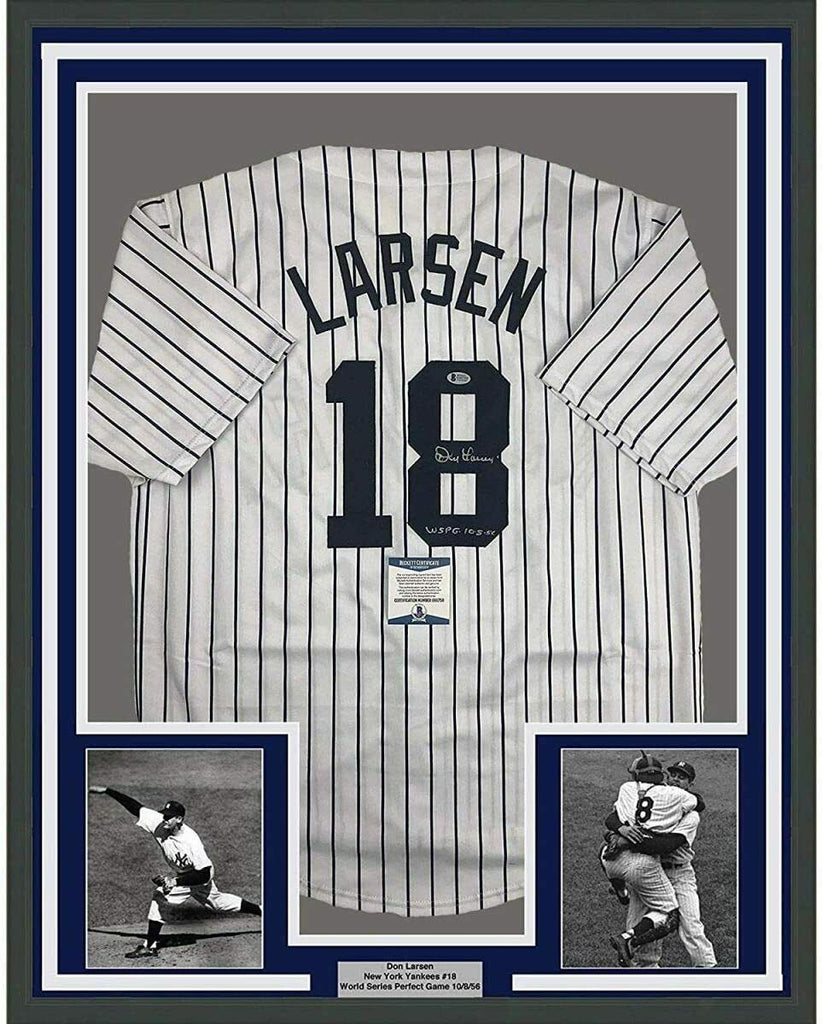 Framed Autographed/Signed Don Larsen Inscribed 33x42 Pinstripe Jersey BAS COA The item is professionally framed & matted with two 8x10 photos, measures 33"x42" and is ready to be hung in your man cave! NOTE: COA card will be mounted on the back of the frame, not inside it on top of the jersey as seen in the picture.
