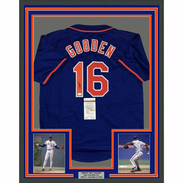 FRAMED Autographed/Signed DWIGHT DOC GOODEN 33x42 New York Blue Jersey JSA COA The item is professionally framed and matted with two 8x10 photos, measures 33x42 inches and is ready to be hung in your man cave! NOTE: COA card will be mounted on the back of the frame, not inside it on top of the jersey as seen in the picture.