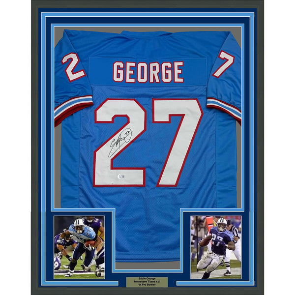 Framed Autographed/Signed Eddie George 35x39 Tennessee Retro Jersey Beckett COA The item is professionally framed and matted with two 5x7 photos, measures 35x39 inches and is ready to be hung in your man cave! Photo and matting requests can be made.