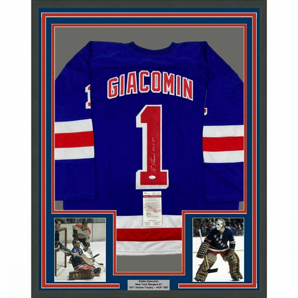 FRAMED Autographed/Signed EDDIE GIACOMIN HOF 33x42 New York Blue Jersey JSA COA The item is professionally framed & matted with two 8x10 photos, measures 33"x42" and is ready to be hung in your man cave! NOTE: COA card will be mounted on the back of the frame, not inside it on top of the jersey as seen in the picture. Please allow up to 5 business days for the item to be framed, packaged safely, and picked up by USPS. Photo and matting requests can be made.