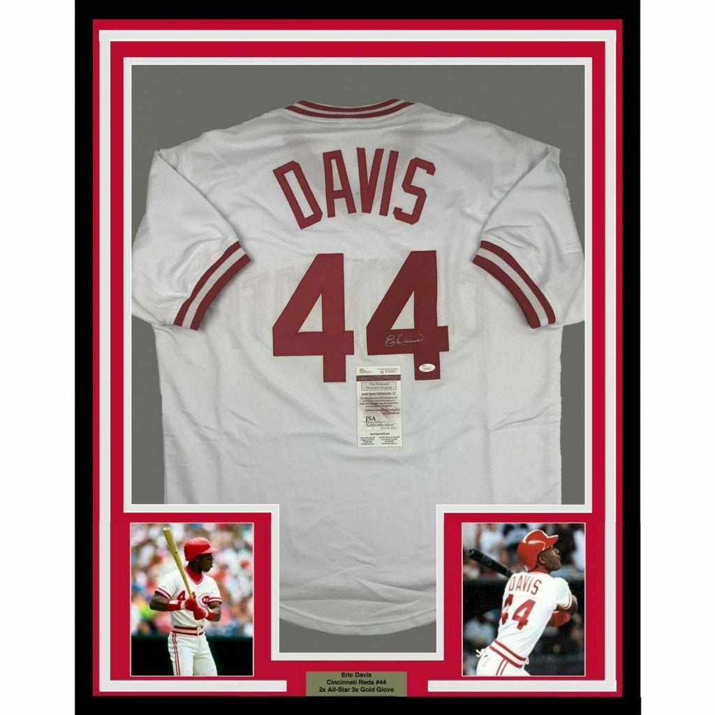 FRAMED Autographed/Signed ERIC DAVIS 33x42 Cincinnati White Jersey JSA COA Auto The item is professionally framed & matted with two 8x10 photos, measures 33"x42" and is ready to be hung in your man cave! NOTE: COA card will be mounted on the back of the frame, not inside it on top of the jersey as seen in the picture. Please allow up to 5 business days for the item to be framed, packaged safely, and picked up by UPS. Photo and matting requests can be made.