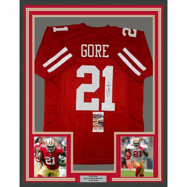 FRAMED Autographed/Signed FRANK GORE 33x42 San Francisco Red Jersey JSA COA Auto The item is professionally framed & matted with two 8x10 photos, measures 33"x42" and is ready to be hung in your man cave! NOTE: COA card will be mounted on the back of the frame, not inside it on top of the jersey as seen in the picture.