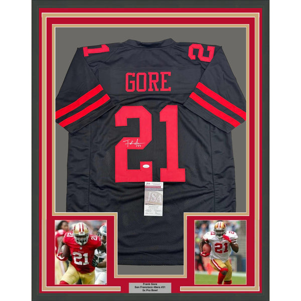 Framed Autographed/Signed Frank Gore 35x39 San Francisco Black Jersey BAS COA The item is professionally framed and matted with two 5x7 photos, measures 35x39 inches and is ready to be hung in your man cave! Photo and matting requests can be made.