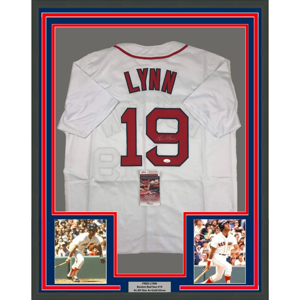 FRAMED Autographed/Signed FRED LYNN 33x42 Boston White Baseball Jersey JSA COA The item is professionally framed & matted with two 8x10 photos, measures 33"x42" and is ready to be hung in your man cave! NOTE: COA card will be mounted on the back of the frame, not inside it on top of the jersey as seen in the picture.