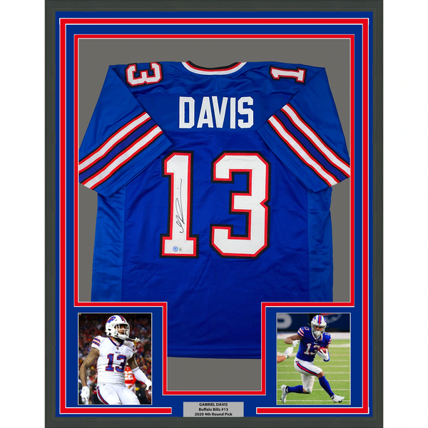 Framed Autographed/Signed Gabriel Gabe Davis 33x42 Buffalo Blue Jersey BAS COA The item is professionally framed & matted with two 8x10 photos, measures 33"x42" and is ready to be hung in your man cave! NOTE: COA card will be mounted on the back of the frame, not inside it on top of the jersey as seen in the picture.