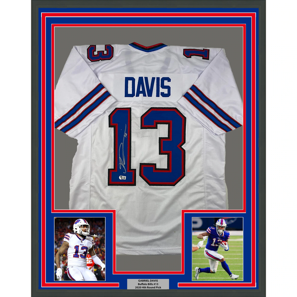 Framed Autographed/Signed Gabriel Gabe Davis 33x42 Buffalo White Jersey BAS COA The item is professionally framed & matted with two 8x10 photos, measures 33"x42" and is ready to be hung in your man cave! NOTE: COA card will be mounted on the back of the frame, not inside it on top of the jersey as seen in the picture.