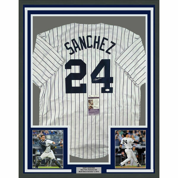 FRAMED Autographed/Signed GARY SANCHEZ 33x42 New York Pinstripe Jersey JSA COA The item is professionally framed & matted with two 8x10 photos, measures 33"x42" and is ready to be hung in your man cave! NOTE: COA card will be mounted on the back of the frame, not inside it on top of the jersey as seen in the picture. Please allow up to 5 business days for the item to be framed, packaged safely, and picked up by UPS. Photo and matting requests can be made.