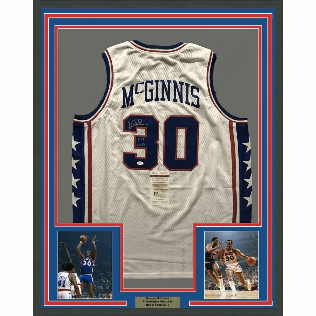 FRAMED Autographed/Signed GEORGE MCGINNIS 33x42 Philly White Jersey JSA COA AUto The item is professionally framed & matted with two 8x10 photos, measures 33"x42" and is ready to be hung in your man cave! NOTE: COA card will be mounted on the back of the frame, not inside it on top of the jersey as seen in the picture. Photo and matting requests can be made.