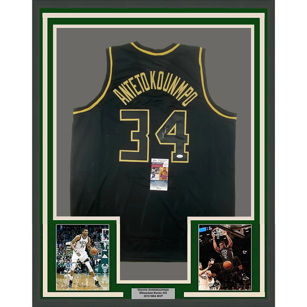 Framed Autographed/Signed Giannis Antetokounmpo 33x42 Blackout Jersey JSA COA