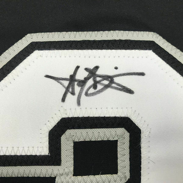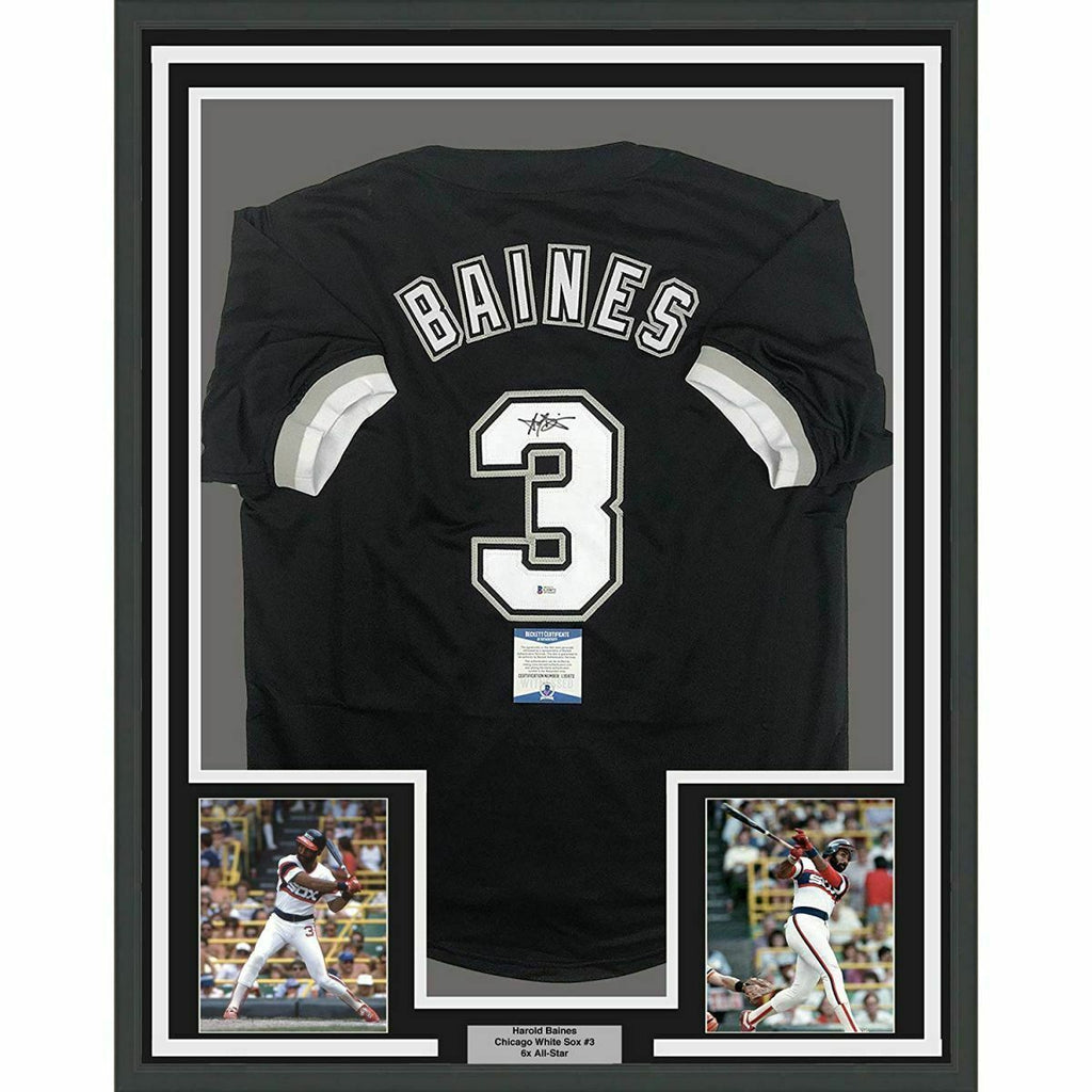 FRAMED Autographed/Signed HAROLD BAINES 33x42 Chicago Black Jersey Beckett COA The item is professionally framed & matted with two 8x10 photos, measures 33"x42" and is ready to be hung in your man cave! NOTE: COA card will be mounted on the back of the frame, not inside it on top of the jersey as seen in the picture.