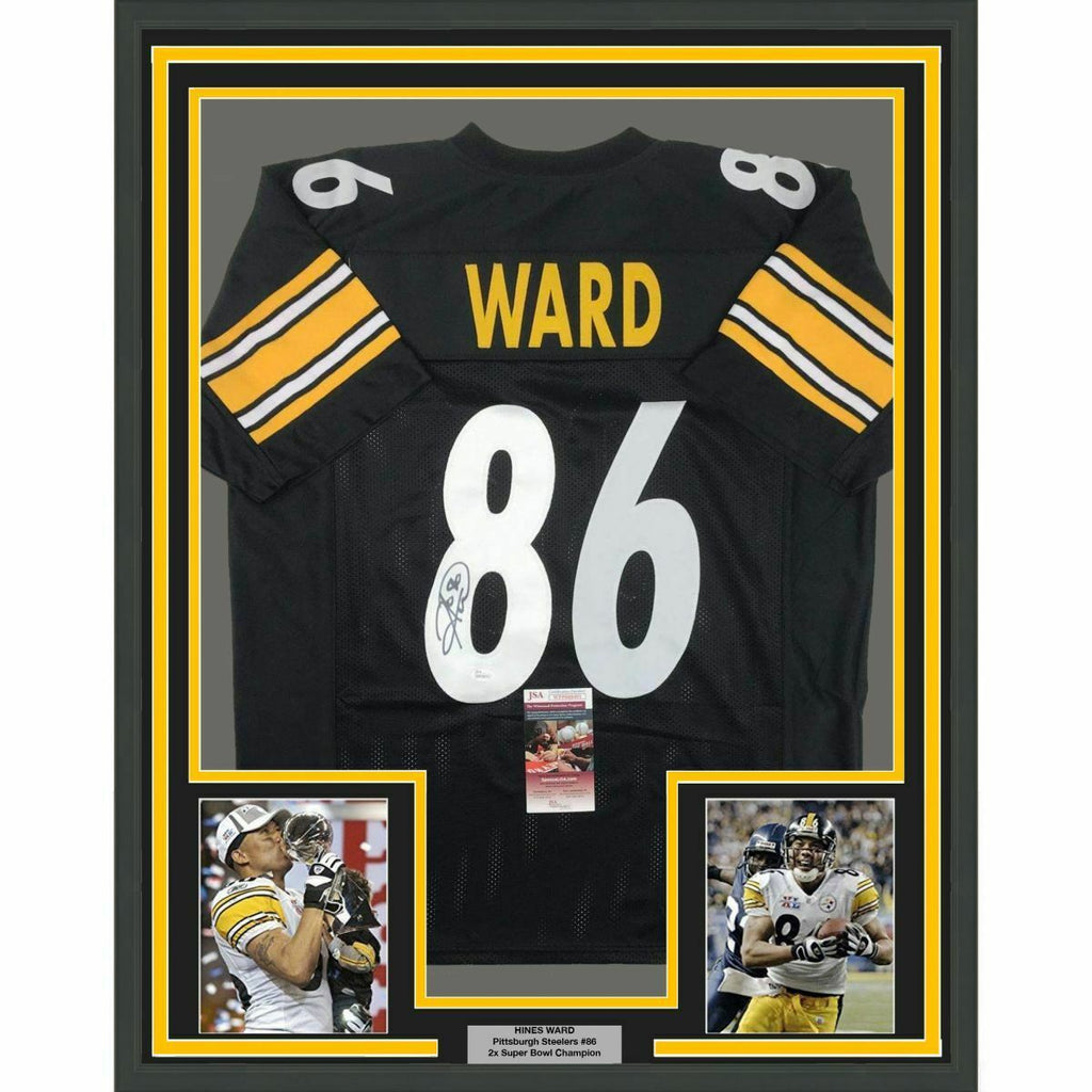 FRAMED Autographed/Signed HINES WARD 33x42 Pittsburgh Black Jersey JSA COA Auto The item is professionally framed & matted with two 8x10 photos, measures 33"x42" and is ready to be hung in your man cave! NOTE: COA card will be mounted on the back of the frame, not inside it on top of the jersey as seen in the picture.