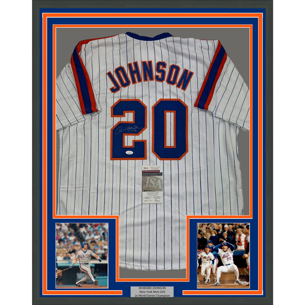 Framed Autographed/Signed Howard Johnson 35x39 New York Pinstripe Jersey JSA COA The item is professionally framed and matted with two 5x7 photos, measures 35x39 inches and is ready to be hung in your man cave! Photo and matting requests can be made.