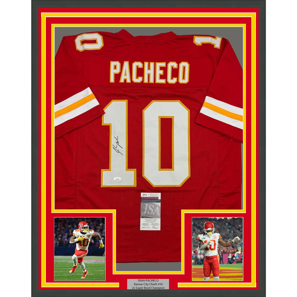 Framed Autographed/Signed Isiah Pacheco 35x39 Kansas City Red Jersey JSA COA The item is professionally framed and matted with two 5x7 photos, measures 35x39 inches and is ready to be hung in your man cave! Photo and matting requests can be made.