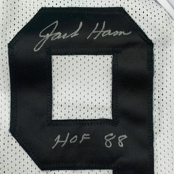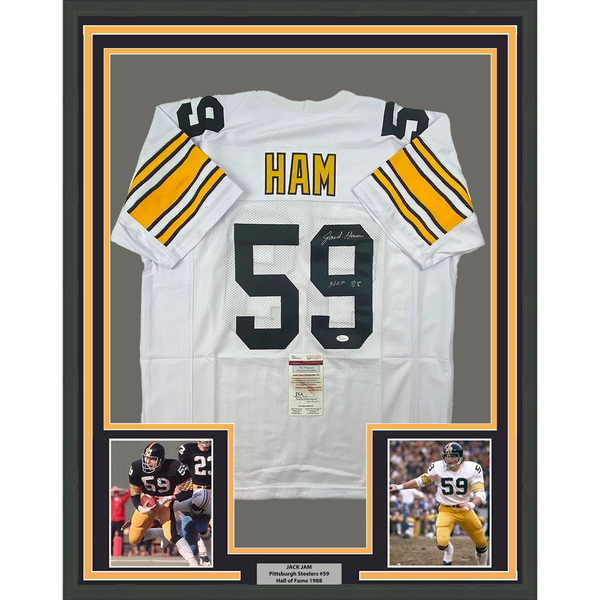 Framed Autographed/Signed Jack Ham HOF 88 33x42 Pittsburgh White Jersey JSA COA The item is professionally framed & matted with two 8x10 photos, measures 33"x42" and is ready to be hung in your man cave! NOTE: COA card will be mounted on the back of the frame, not inside it on top of the jersey as seen in the picture. Photo and matting requests can be made.