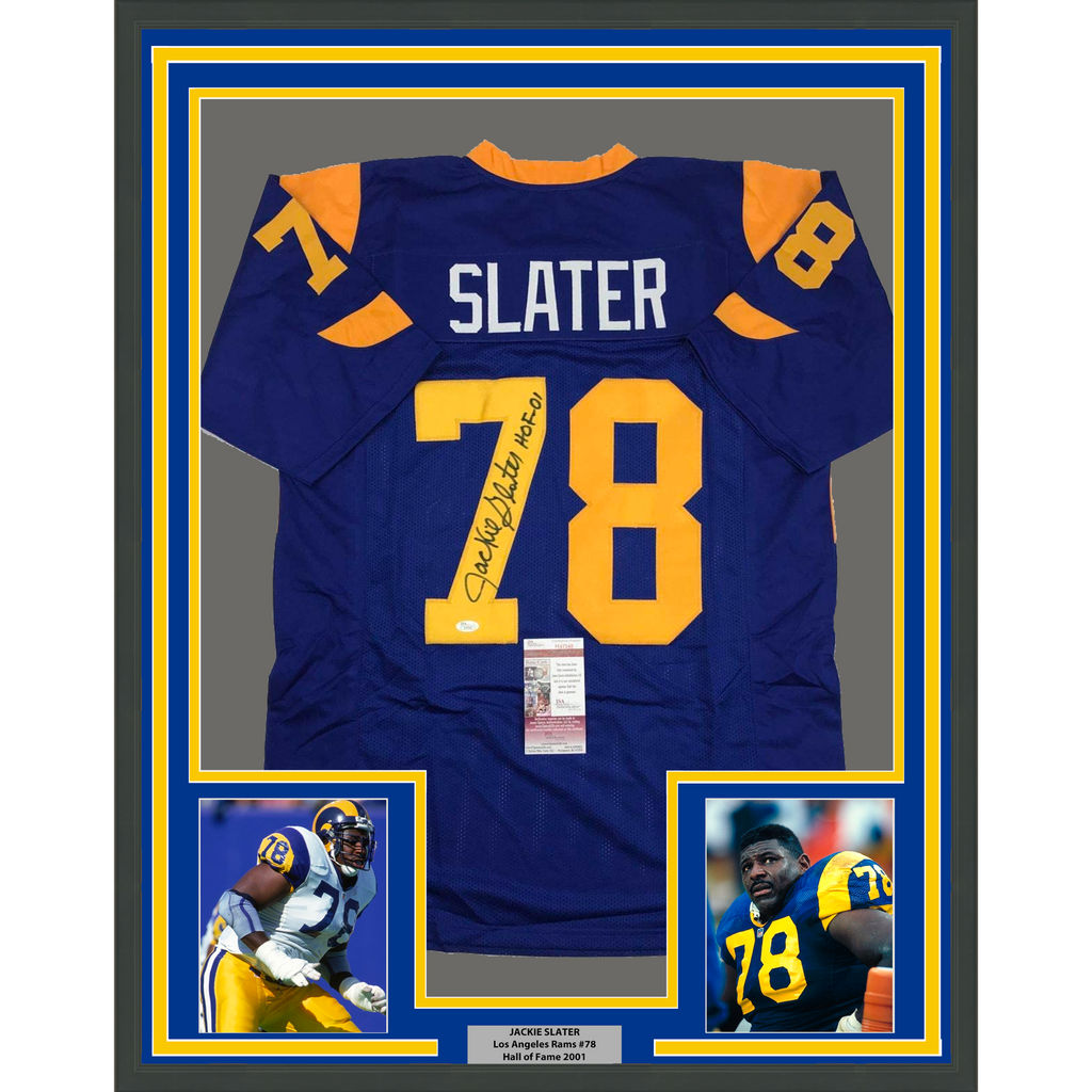 Framed Autographed/Signed Jackie Slater 33x42 HOF 01 LA Blue Jersey JSA COA