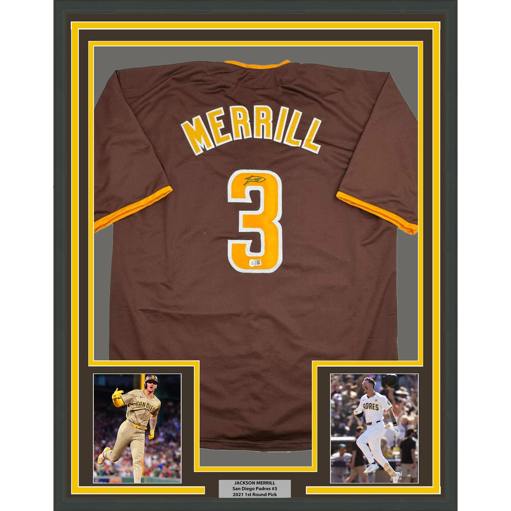 Framed Autographed/Signed Jackson Merrill 35x39 San Diego Brown Jersey BAS COA The item is professionally framed and matted with two 5x7 photos, measures 35x39 inches and is ready to be hung in your man cave! Photo and matting requests can be made.