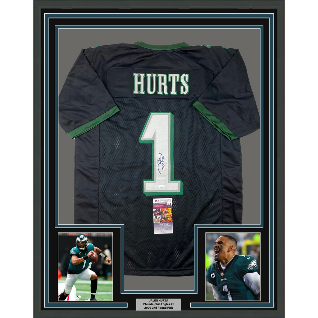 Framed Autographed/Signed Jalen Hurts 33x42 #1 Philadelphia Black Jersey JSA COA