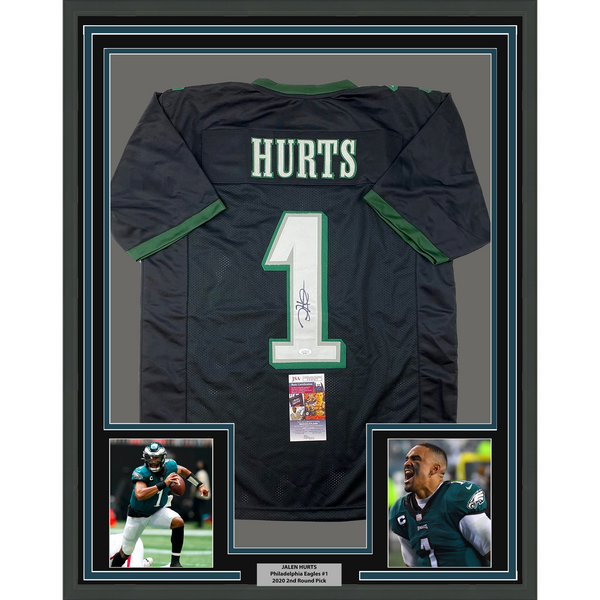 Framed Autographed/Signed Jalen Hurts 33x42 #1 Philadelphia Black Jersey JSA COA The item is professionally framed & matted with two 8x10 photos, measures 33"x42" and is ready to be hung in your man cave! NOTE: COA card will be mounted on the back of the frame, not inside it on top of the jersey as seen in the picture.