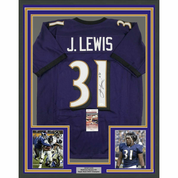 FRAMED Autographed/Signed JAMAL LEWIS 33x42 Baltimore Purple Jersey JSA COA Auto The item is professionally framed & matted with two 8x10 photos, measures 33"x42" and is ready to be hung in your man cave! NOTE: COA card will be mounted on the back of the frame, not inside it on top of the jersey as seen in the picture.