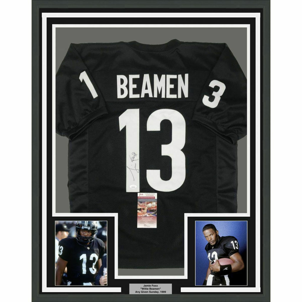 FRAMED Autographed/Signed JAMIE FOXX Willie Beamen 33x42 Black Jersey JSA COA The item is professionally framed & matted with two 8x10 photos, measures 33"x42" and is ready to be hung in your man cave! NOTE: COA card will be mounted on the back of the frame, not inside it on top of the jersey as seen in the picture.