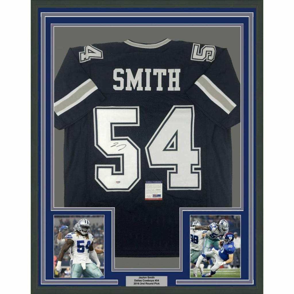 FRAMED Autographed/Signed JAYLON SMITH 33x42 Dallas Blue Jersey PSA/DNA COA Auto The item is professionally framed & matted with two 8x10 photos, measures 33"x42" and is ready to be hung in your man cave! NOTE: COA card will be mounted on the back of the frame, not inside it on top of the jersey as seen in the picture. Please allow up to 5 business days for the item to be framed, packaged safely, and picked up by USPS. Photo and matting requests can be made.