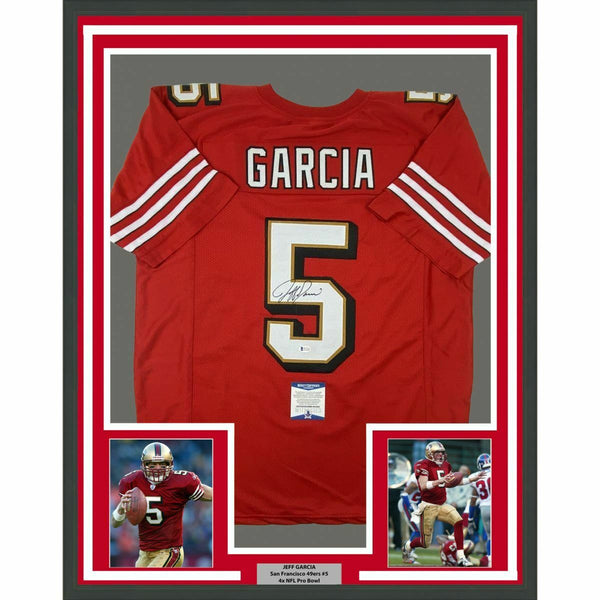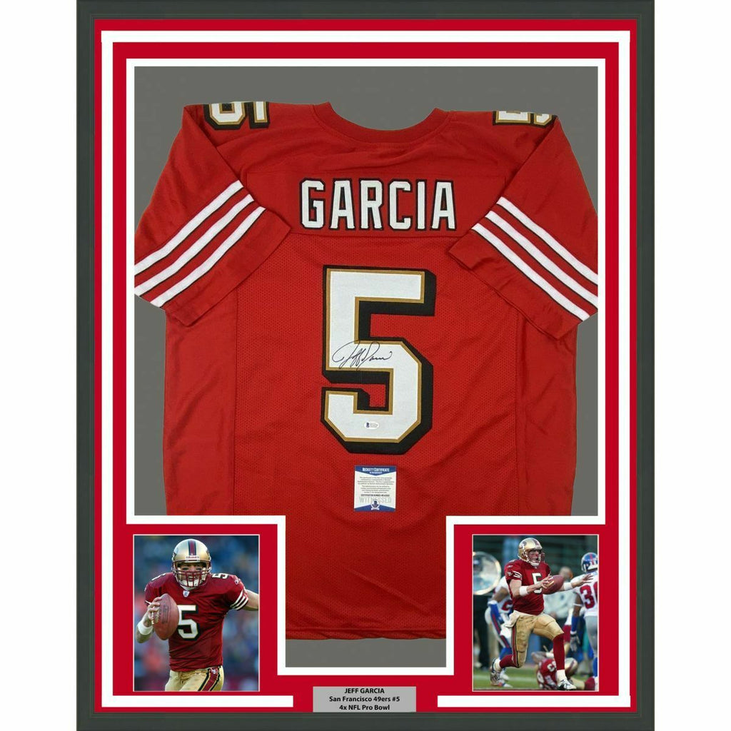 FRAMED Autographed/Signed JEFF GARCIA 33x42 Red Football Jersey BAS COA The item is professionally framed & matted with two 8x10 photos, measures 33"x42" and is ready to be hung in your man cave! NOTE: COA card will be mounted on the back of the frame, not inside it on top of the jersey as seen in the picture.