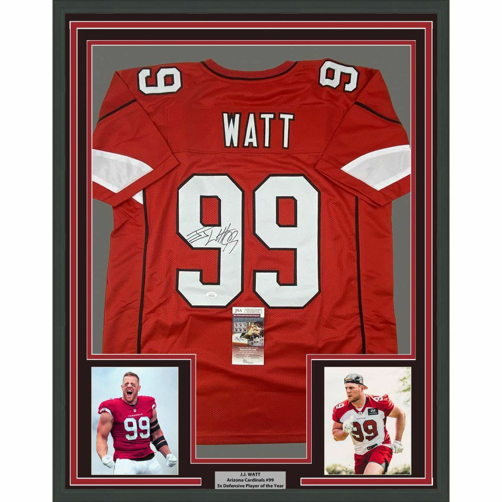 FRAMED Autographed/Signed JJ J.J. WATT 33x42 Arizona Red Football Jersey JSA COA The item is professionally framed & matted with two 8x10 photos, measures 33"x42" and is ready to be hung in your man cave! NOTE: COA card will be mounted on the back of the frame, not inside it on top of the jersey as seen in the picture. Please allow up to 5 business days for the item to be framed, packaged safely, and picked up by UPS. Photo and matting requests can be made.