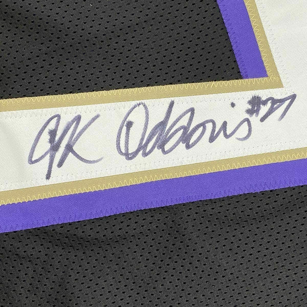 FRAMED Autographed/Signed JK J.K. Dobbins 33x42 Black Football Jersey JSA COA The item is professionally framed & matted with two 8x10 photos, measures 33"x42" and is ready to be hung in your man cave! NOTE: COA card will be mounted on the back of the frame, not inside it on top of the jersey as seen in the picture.