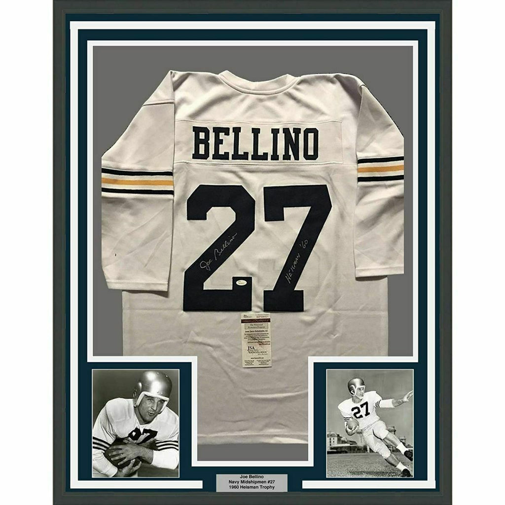 FRAMED Autographed/Signed JOE BELLINO 33x42 Navy White College Jersey JSA COA The item is professionally framed & matted with two 8x10 photos, measures 33"x42" and is ready to be hung in your man cave! NOTE: COA card will be mounted on the back of the frame, not inside it on top of the jersey as seen in the picture.