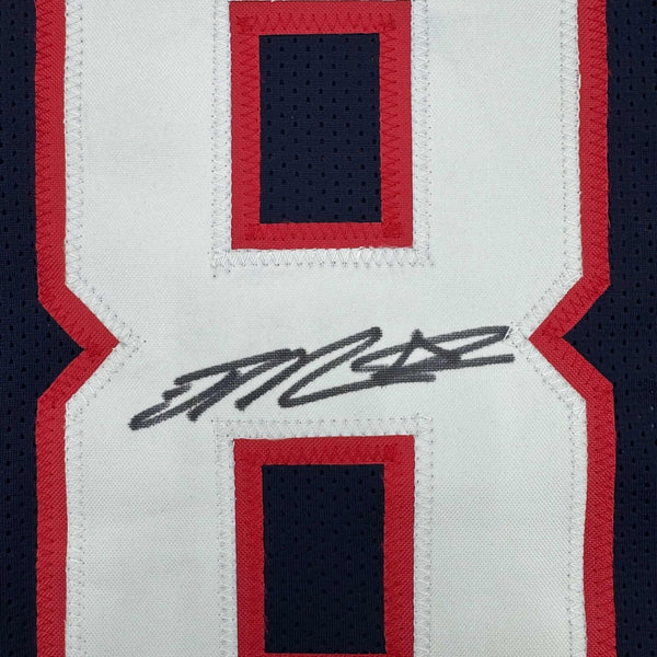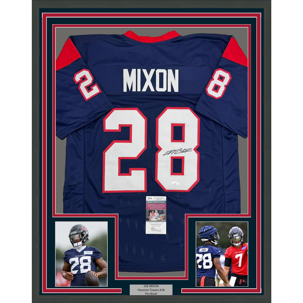 Framed Autographed/Signed Joe Mixon 35x39 Houston Blue Jersey JSA COA The item is professionally framed and matted with two 5x7 photos, measures 35x39 inches and is ready to be hung in your man cave! Photo and matting requests can be made.