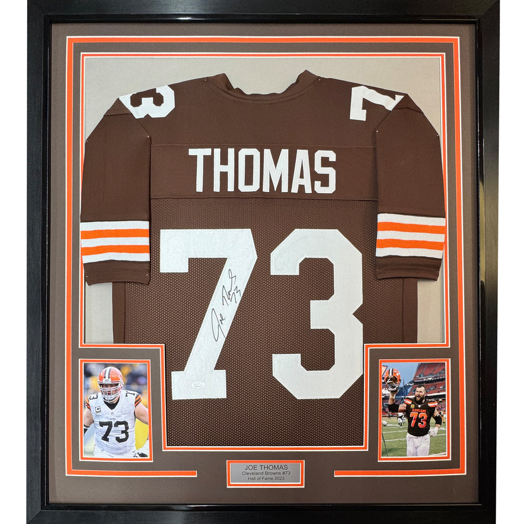 Framed Autographed/Signed Joe Thomas 35x39 Cleveland Brown Jersey JSA COA The item is professionally framed and matted with two 5x7 photos, measures 35x39 inches and is ready to be hung in your man cave! Photo and matting requests can be made.