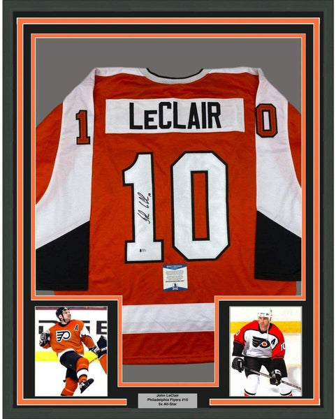 Framed Autographed/Signed John LeClair 35x39 Orange Jersey Beckett BAS COA The item is professionally framed and matted with two 5x7 photos, measures 35 inches by 39 inches and is ready to be hung in your man cave! Photo and matting requests can be made.