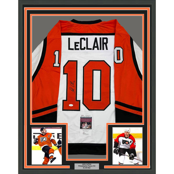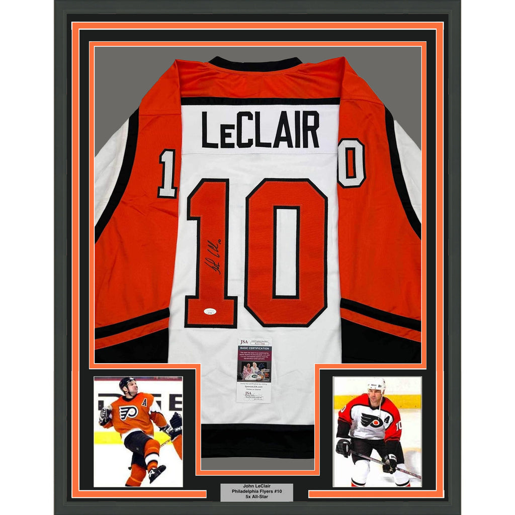 Framed Autographed/Signed John LeClair 35x39 Philadelphia White Jersey JSA COA The item is professionally framed and matted with two 5x7 photos, measures 35x39 inches and is ready to be hung in your man cave! Photo and matting requests can be made.