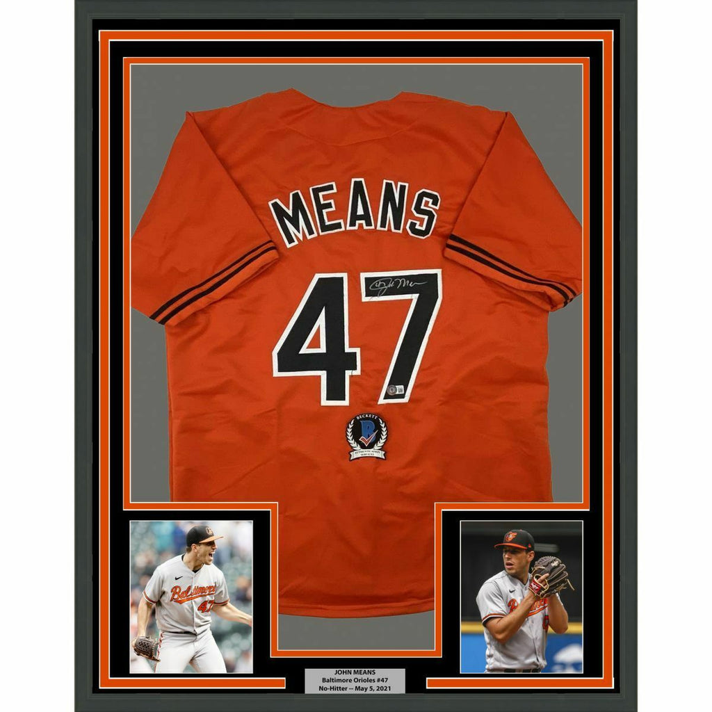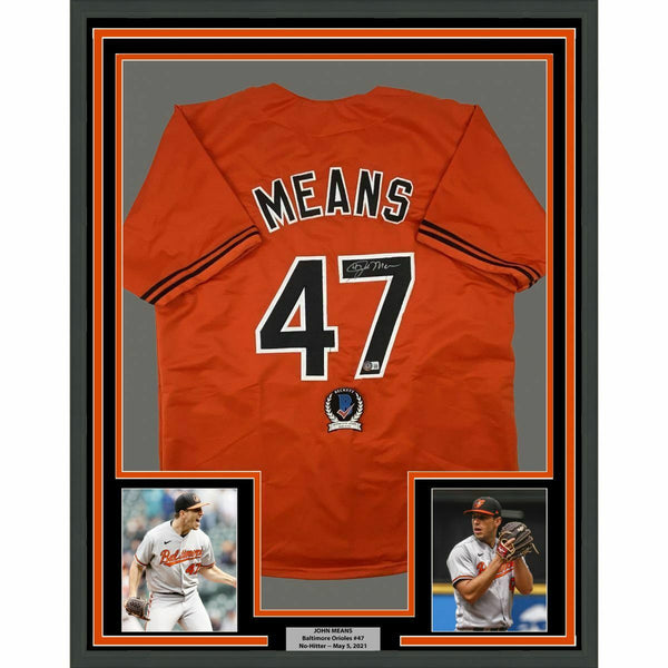 FRAMED Autographed/Signed JOHN MEANS 33x42 Baltimore Orange Jersey Beckett COA The item is professionally framed & matted with two 8x10 photos, measures 33"x42" and is ready to be hung in your man cave! NOTE: COA card will be mounted on the back of the frame, not inside it on top of the jersey as seen in the picture.